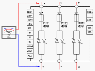1.萬用表模塊檢查法 關(guān)閉主電源 拆除負(fù)載 拔除模塊與電路板間六針或九針插pin (R相對(duì)U相) (S相對(duì)V相) (T相對(duì)W相)上下對(duì)量電阻1MΩ 以上正常如圖: