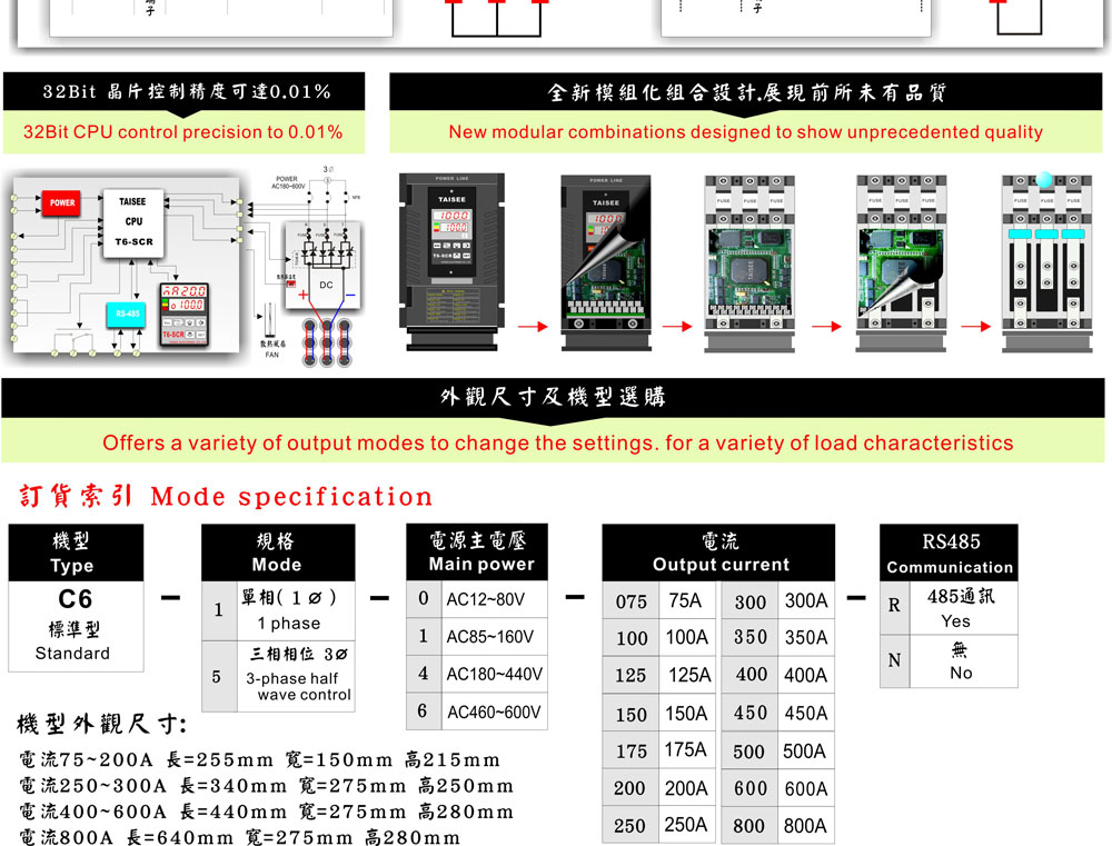 輸入訊號:ON-OFF接點 輸出模式:ON-OFF 電流:30A~500A(三相) 過零啟動停止ON-OFF